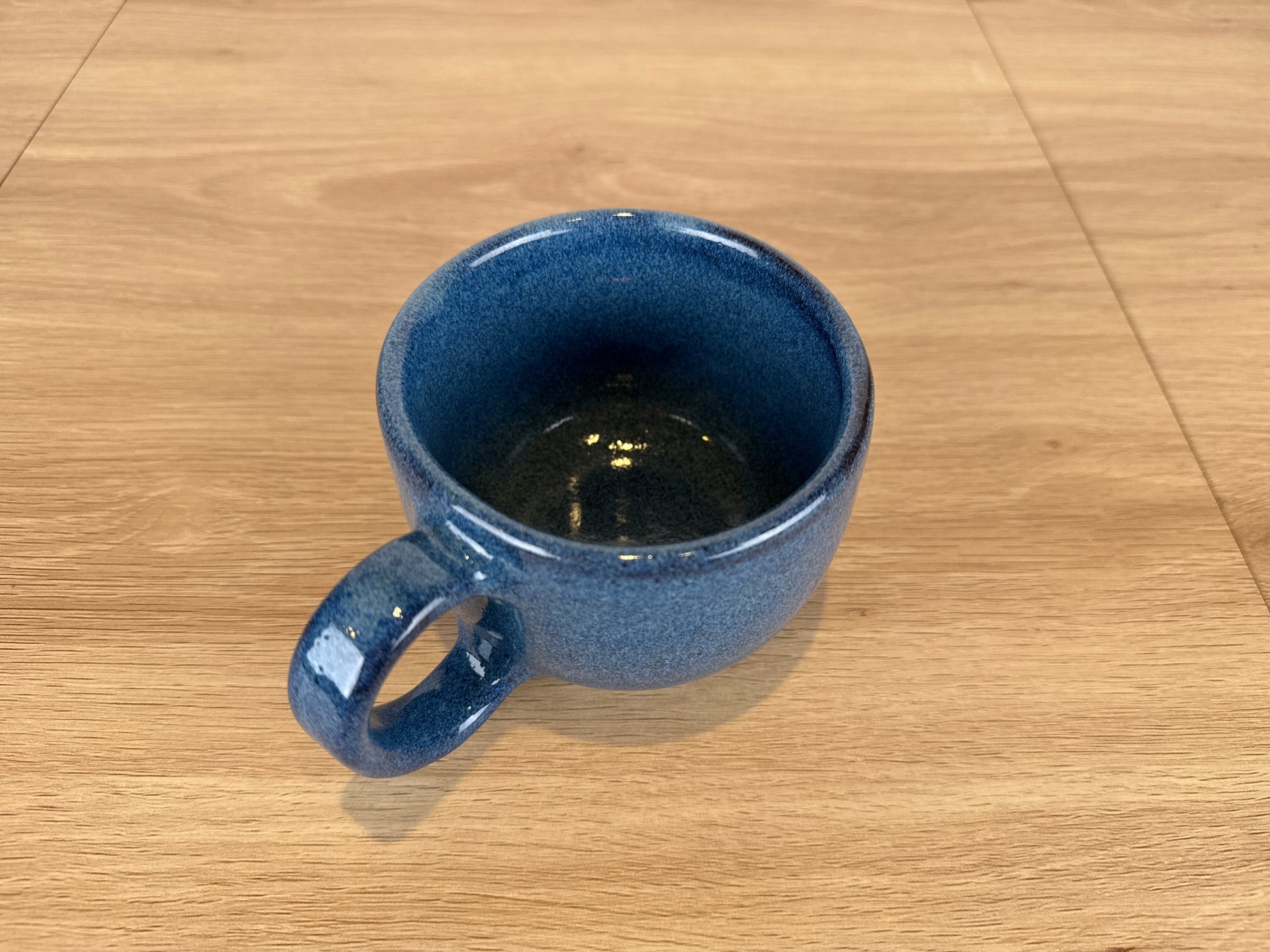 Wheel thrown coffee mug, glazed in dark blue over red clay.