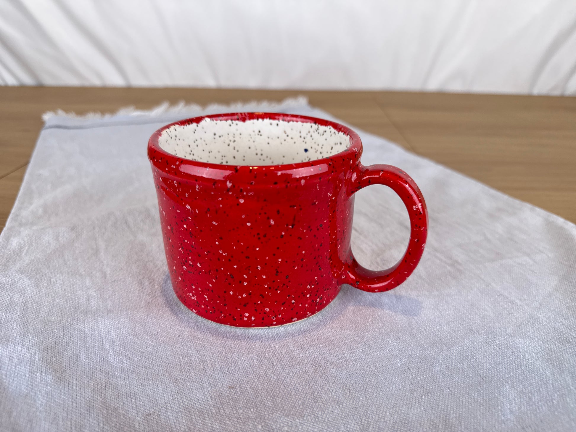 Wheel thrown coffee mug, glazed in bright red with white liner over speckled buff clay.