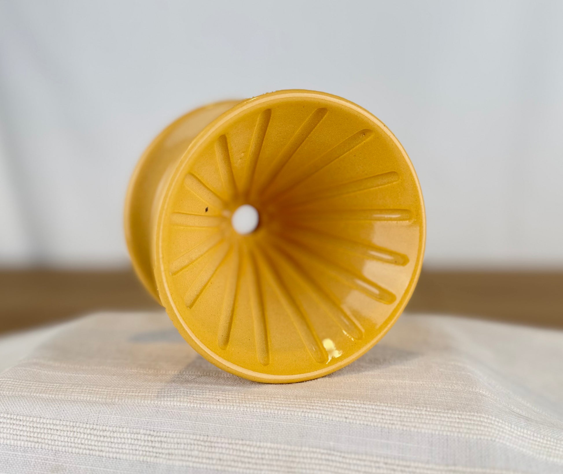 Hand made coffee pour over filter basket, glazed in sunflower yellow, over buff clay. This works with #2 cone coffee filters.