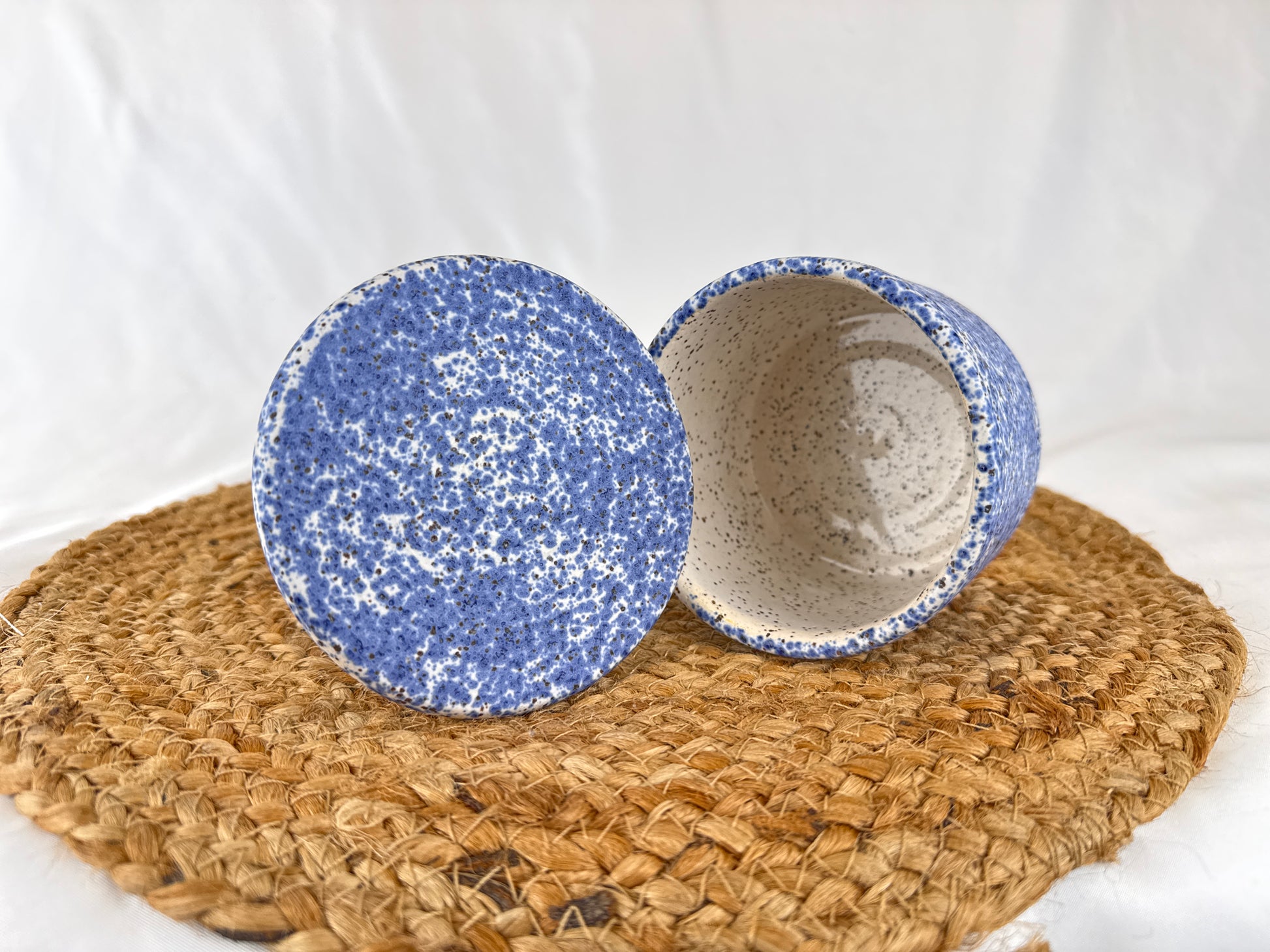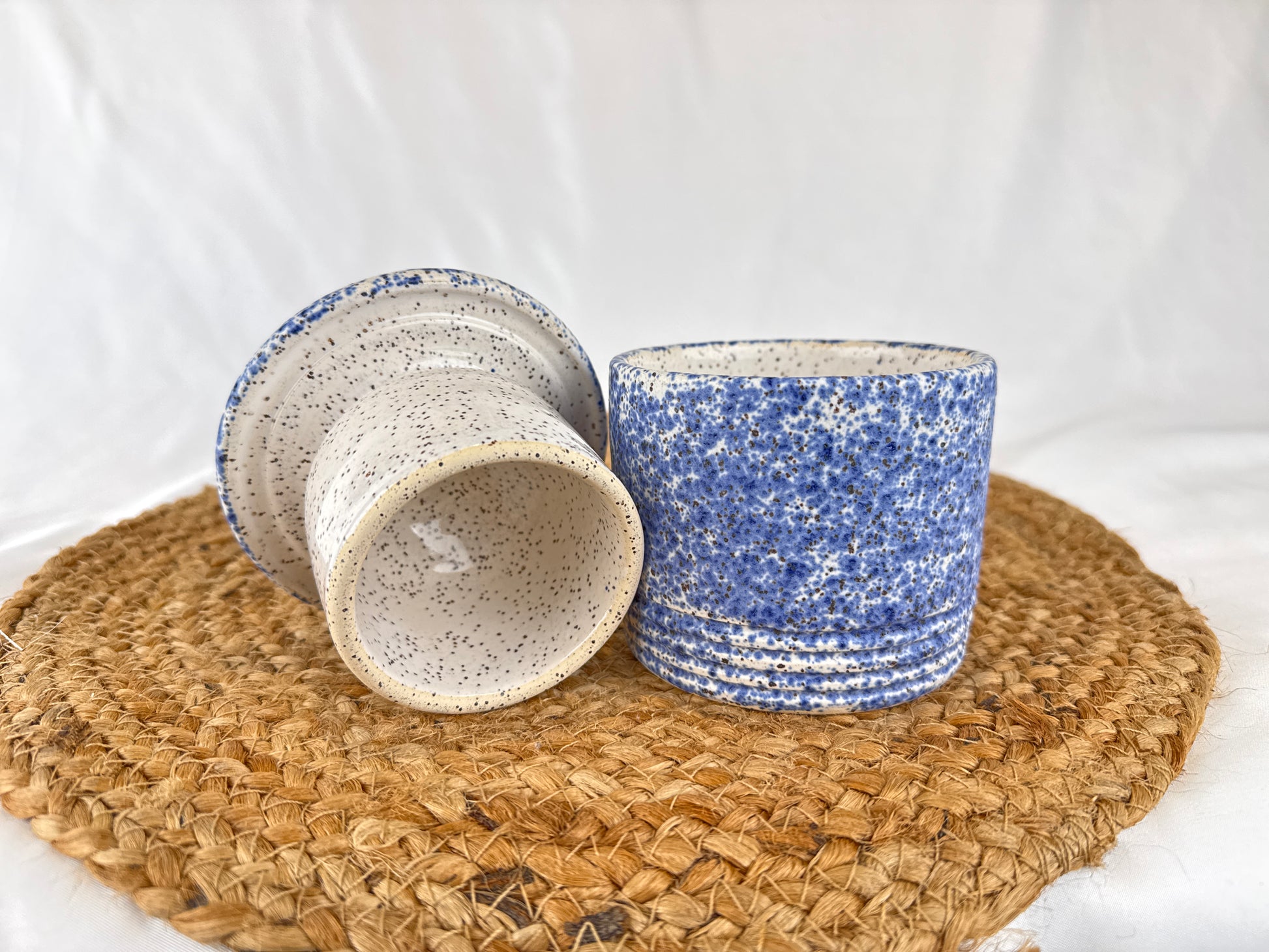 Handmade wheel-thrown butter keeper. Top cup holds 8 oz of butter, which is placed into the bottom dish containing 1/2” of water. The water seals the butter off from the air so it can be left at room temperature without spoiling.