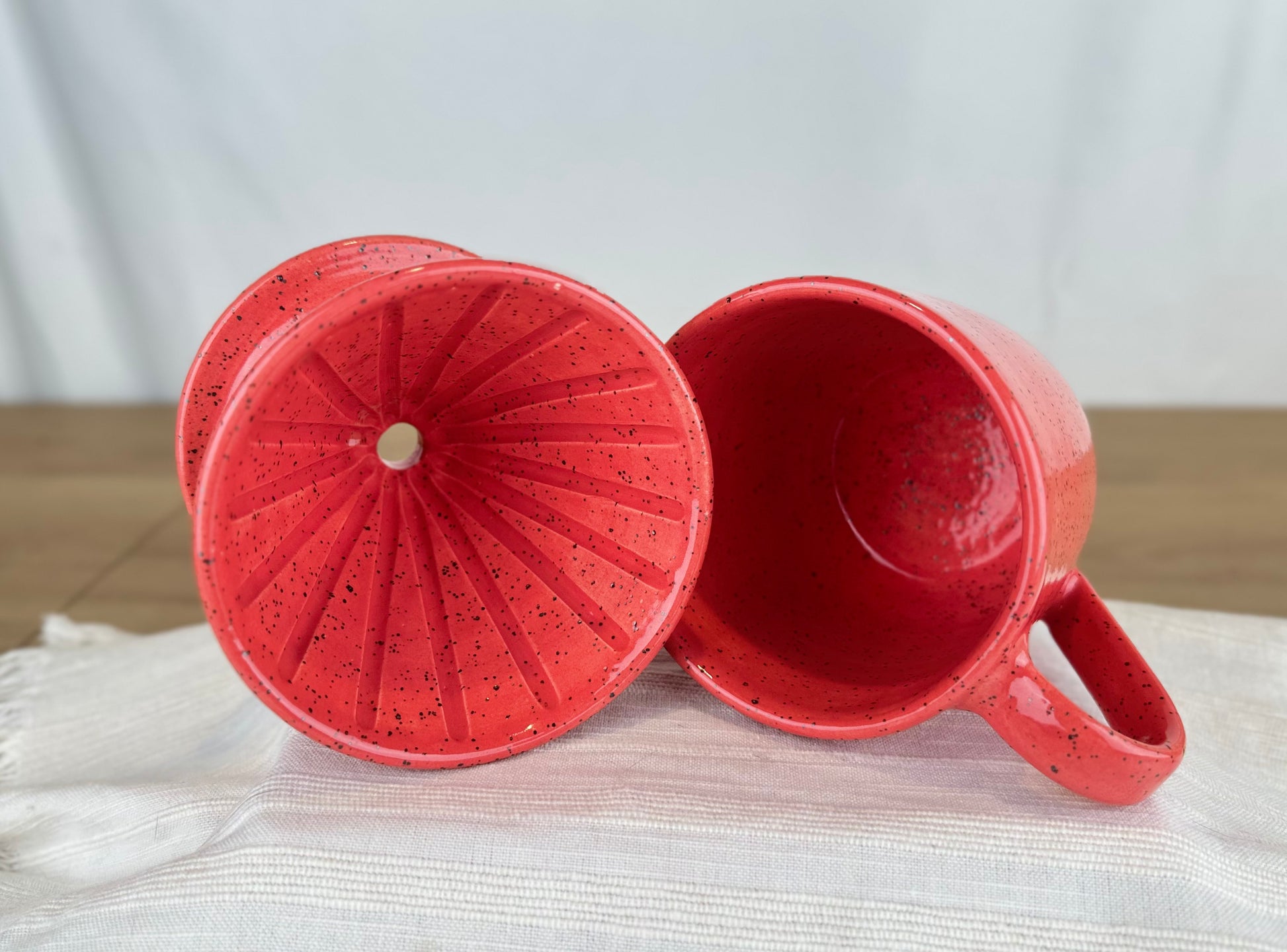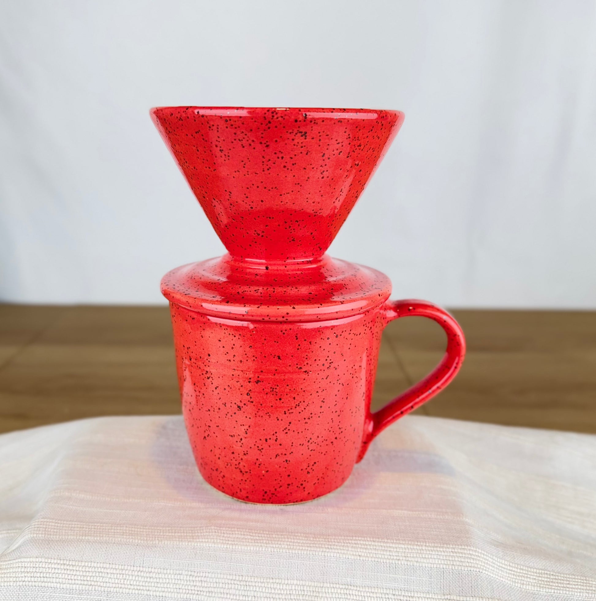 Hand made coffee pour over filter basket and mug, glazed in bright coral red-pink, over speckled buff clay. This works with #2 cone coffee filters.