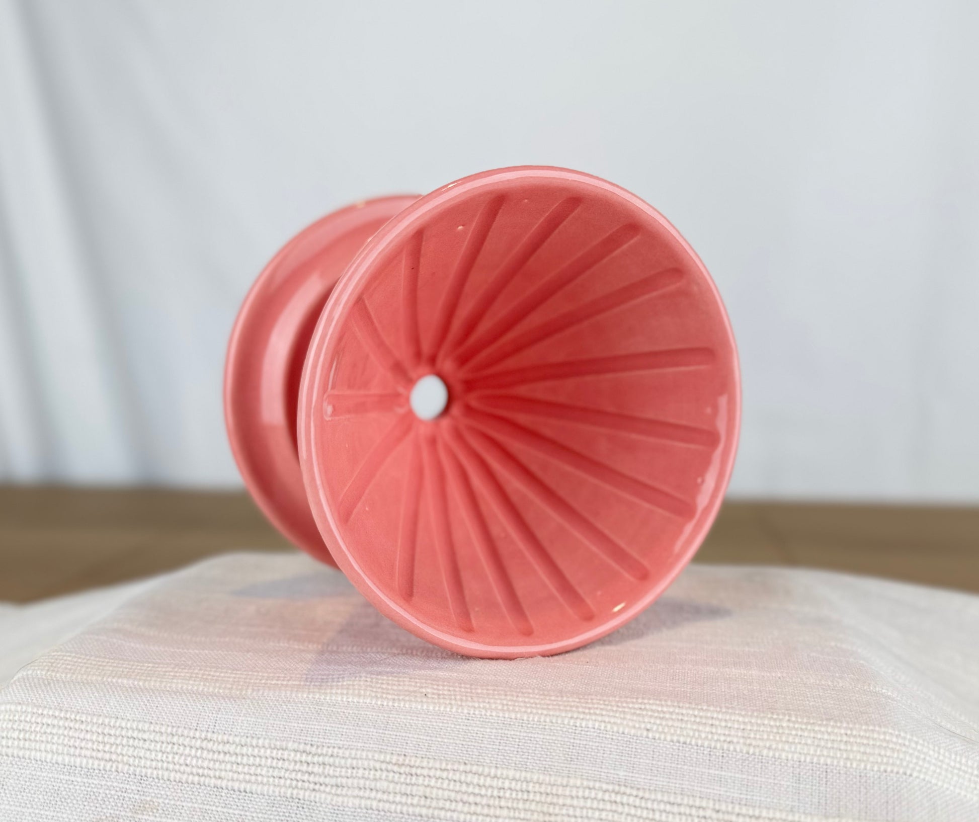 Hand made coffee pour over filter basket, glazed in bright pink, over buff clay. This works with #2 cone coffee filters.