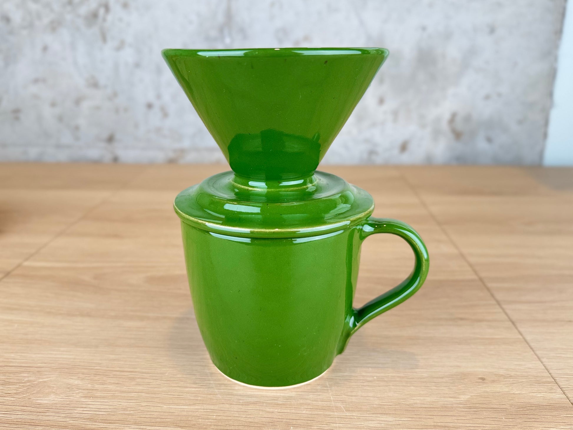 Hand made coffee pour over filter basket and mug, glazed in forest green, over buff clay. This works with #2 cone coffee filters.