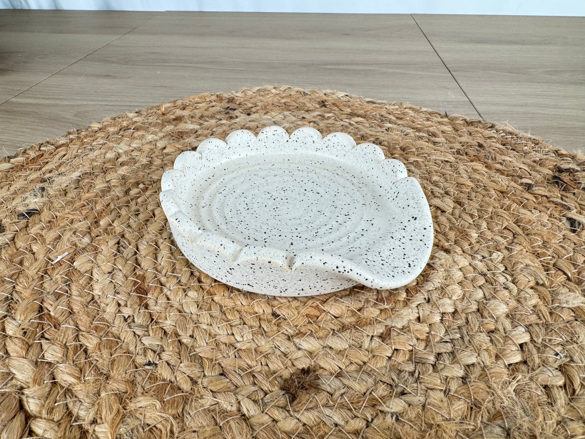 Handmade, wheel-thrown, ceramic spoon rest with hand carved scalloped lip.