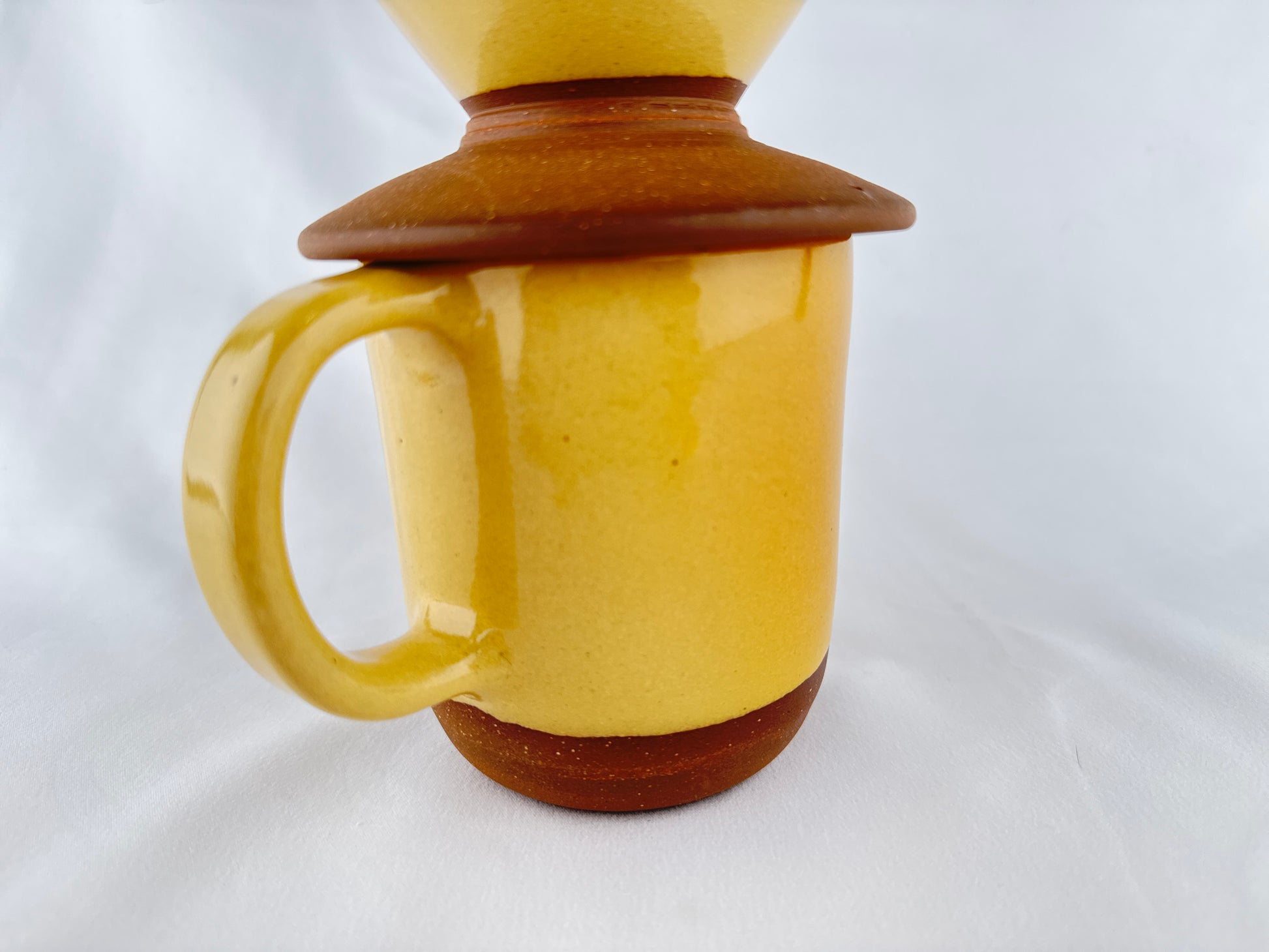 Hand made coffee pour over filter basket and mug, glazed in sunflower yellow, over deep red clay. This works with #2 cone coffee filters.