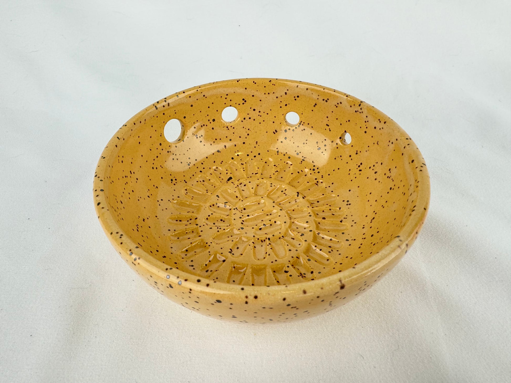 Glazed in sunflower yellow over speckled buff clay.